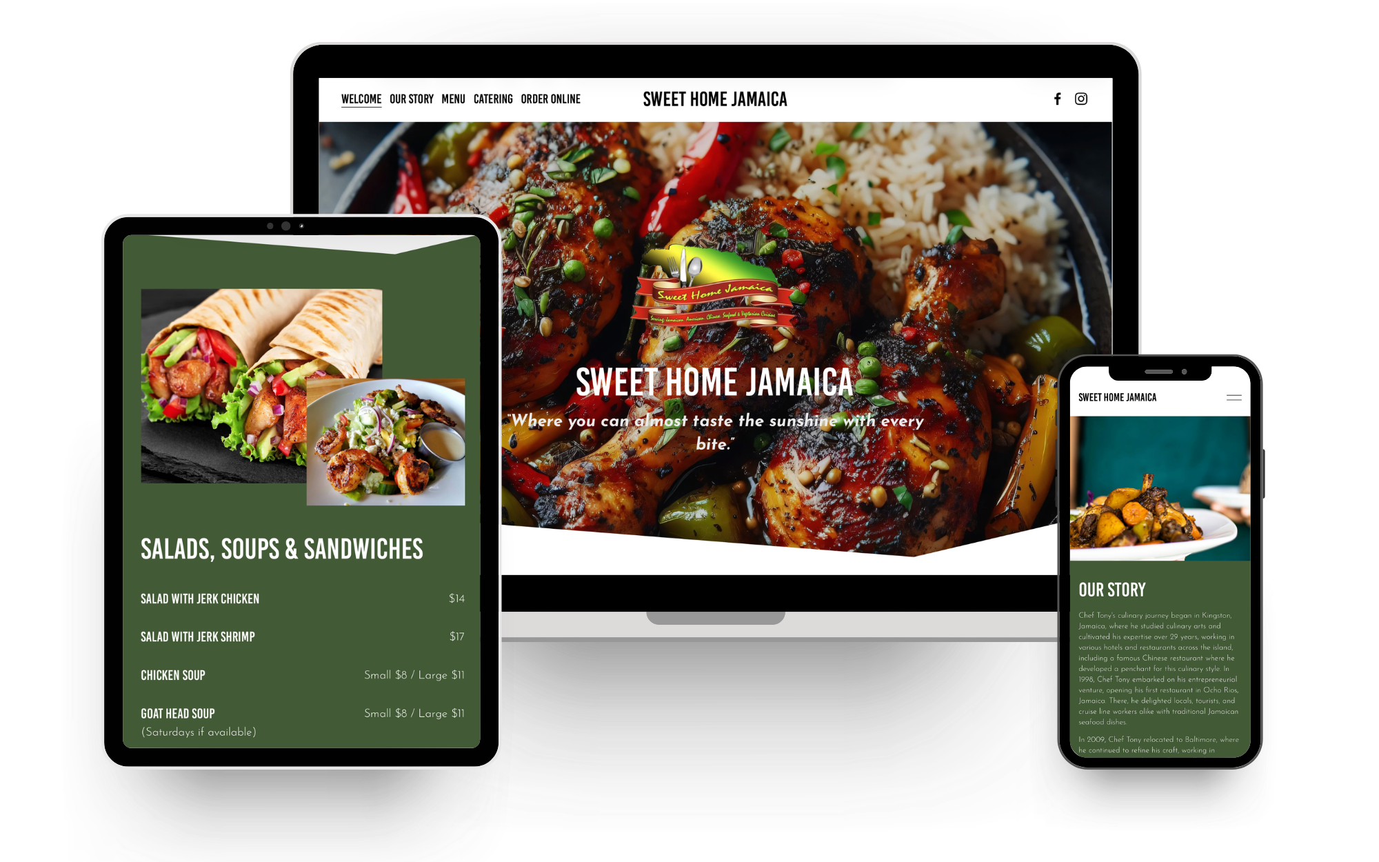 Web design for Sweet Home Jamaica, creating a digital presence that reflects the warmth, vibrancy, and authenticity of Jamaican culture. The site is designed to highlight the richness of the menu and the welcoming, neighborhood atmosphere, using bold visuals and clear navigation to guide users through offerings and essential information. Emphasis is placed on showcasing signature dishes and the freshness of ingredients, while maintaining an accessible, user-friendly experience that encourages both first-time visitors and returning customers to engage with the brand.